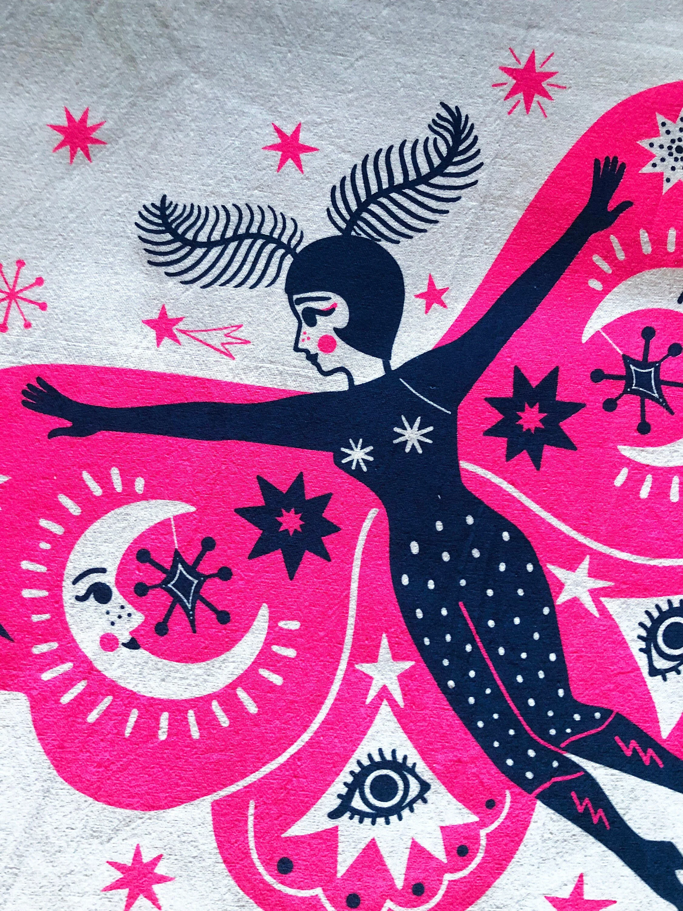 Celestial moth woman, fluorescent pink and navy blue tea towel with moon and stars, 18 x 28" and silk screened on flour sack cotton cloth. This is an original illustration by Maja Andersen and printed locally in Kansas City by Oddities Prints.